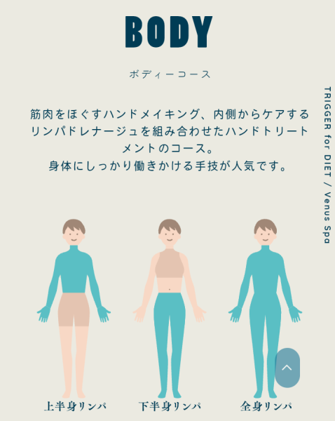 VenusSpaの全身リンパ、上半身リンパコースはデコルテ、首のトリートメント付きです。